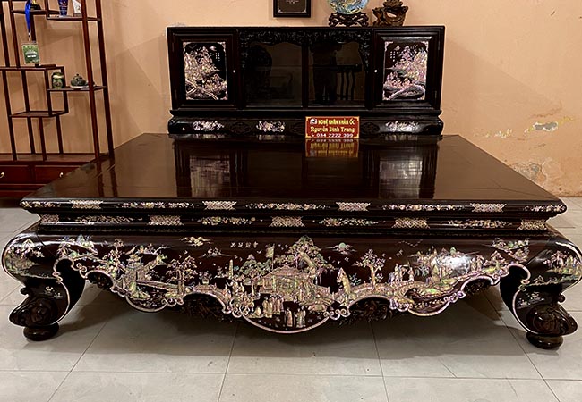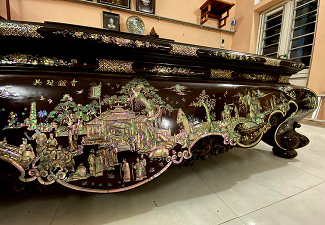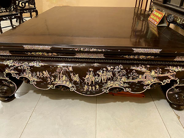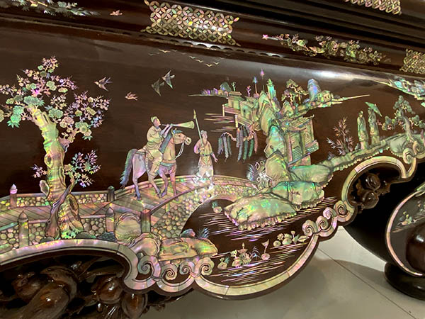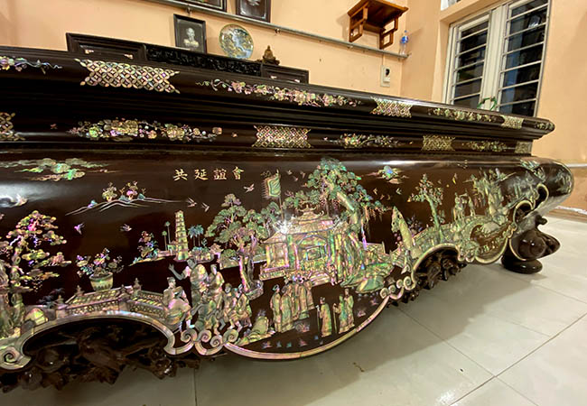 Sập khảm liên chi: Toàn bộ quây sập được khảm ốc tinh xảo, không để trống bề mặt gỗ.