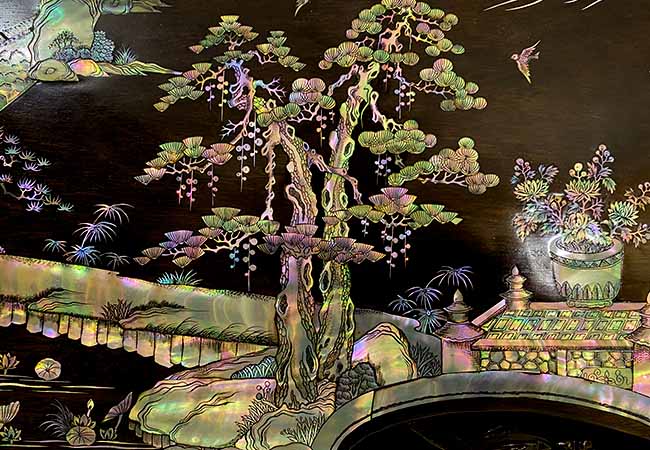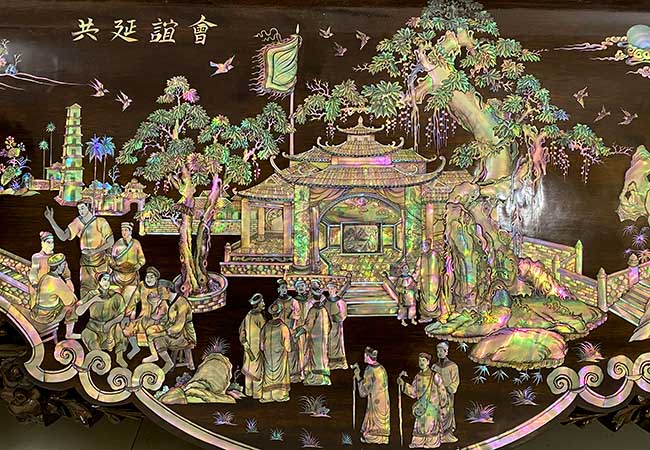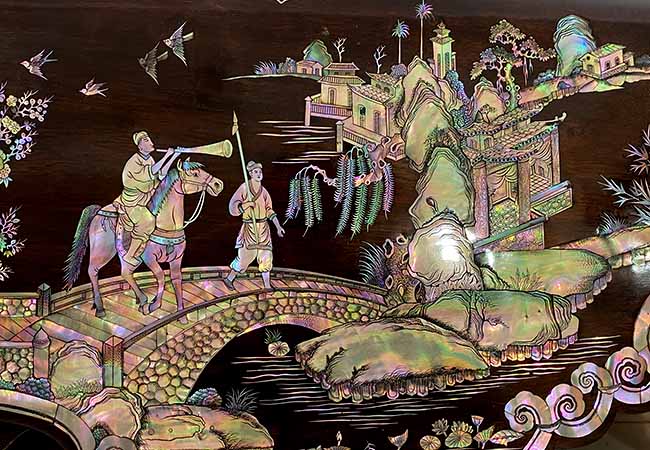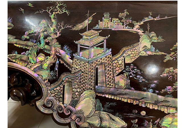 Kỹ thuật khảm: Sử dụng vỏ ốc xà cừ (phổ biến nhất là ốc Singapore) với các dải màu "đỏ lửa, vàng chanh, xanh thiên lý" rực rỡ.