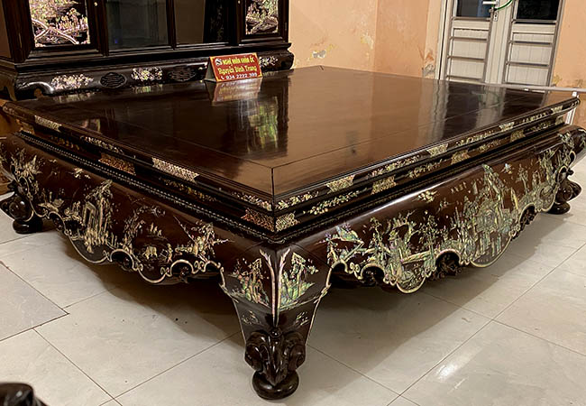 Sập chân quỳ khảm ốc: Kết hợp giữa đục chạm lối cổ và khảm trai ốc ở các điểm nhấn như ba bông.