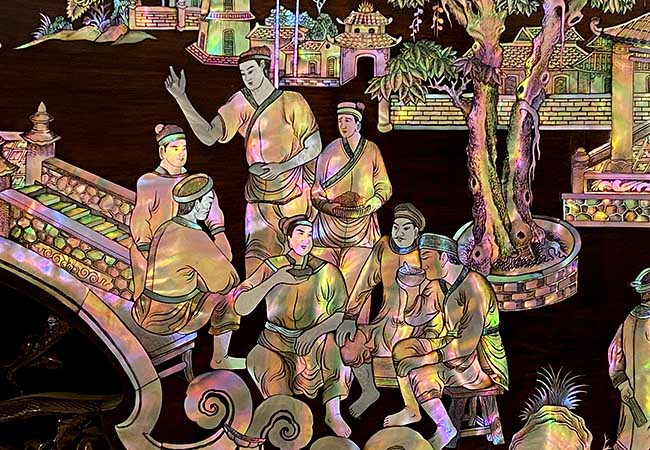 Phong cách: Các nghệ nhân thường khảm theo lối liên chi (khảm kín quây sập) khảm theo tích cổ của Việt Nam, Hội nghị Diên Hồng, sĩ nông công thương, Hai bà trưng